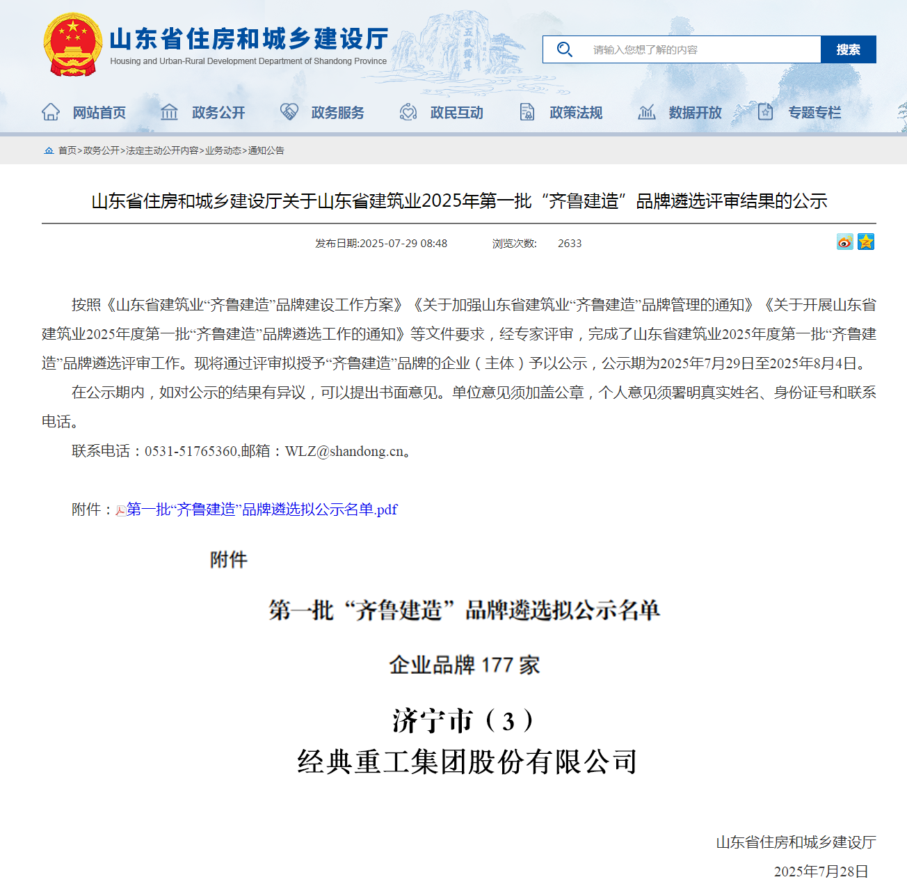 榮耀入選!經典集團榮登2025年第一批“齊魯建造”品牌榜